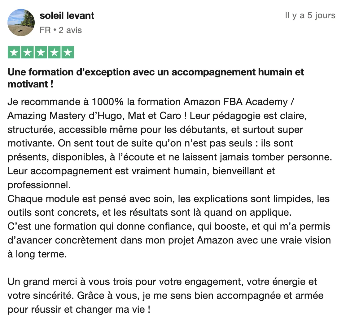 À la fin du Challenge, tu auras la possibilité d’aller plus loin en rejoignant l'Academy Mastery Pro, notre accompagnement complet pour lancer et scaler ton business Amazon.